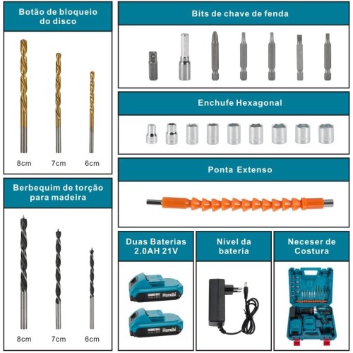 Parafusadeira Furadeira De Impacto Profissional Portátil 21v com 2 baterias 10mm Bivolt + Kit Brocas Sem fio Hanabi